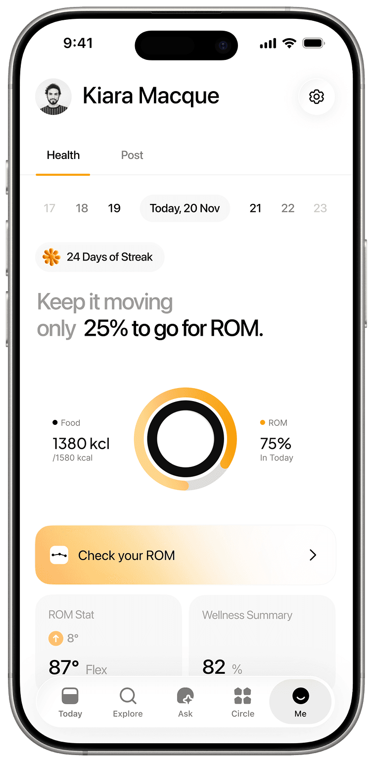 Real-time motion tracking visualizes every rep, offering instant Ai feedback to support better form and smoother recovery.